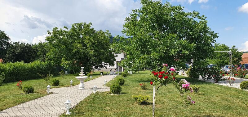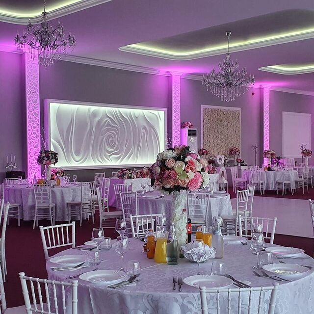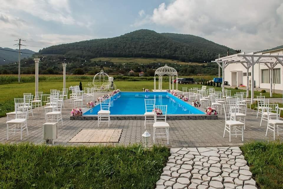 Sală evenimente cu arhitectură modernă, terasă, piscină, parcare și zonă verde generoasă